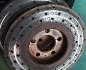 Golf 4のブレーキローターです。ゴルフWは以前のモデルに比べてなぜかパッドがあまり減りません。でも安心できません。この車も表から見ると十分なブレーキ残量だったのですが、タイヤを外して裏側のパッド残量をきちんと点検する事でこのようなトラブルを発見できました。パッドが固着して片効きしています。 |