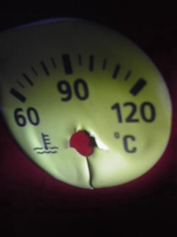 | やっちまいました〜・・・・ 最近の帝王号は水温の上がりが遅く、90℃まで上がることが無くなってしまいました。 ![]() 大体こんな感じです。間違いなくサーモスタットだと判断しました。北海道ですし、ヒーターの効きも弱くなってしまうと寒いより先に危険なんです。デフロスターの機能が正常でないと前が見えなくなってしまいます。深夜の峠を激しく走ると外気温度がマイナス20度にもなります。 翌日、サーモスタットを交換しました。ついでにファンベルト、ウォーターポンプベルトを交換。 で、エア抜き中に気がついたのですが・・・・・・ 全然直ってません。 やっぱり水温は70〜80℃付近から上がらず。 思い切ってメーターを叩いてみました。すると90℃までビョ〜ン!とあがりました(笑) ![]() 原因はこいつ。 後付のカラーメーターが劣化して針の動きを制限していたようです。 サーモスタット交換が無駄になりました・・・・・・。