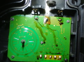 このポンプ、クーラントが外部にも内部にも漏れる。画像のウンコが流れたような跡が内部漏れ。材質、シールの精度が悪いので2万キロほどでこのようにクーラントが侵入してしまった。内部に漏れて制御基盤をショートさせる。そうするとクーラントシャットオフバルブのなんちゃらかんちゃらという故障が入力される。